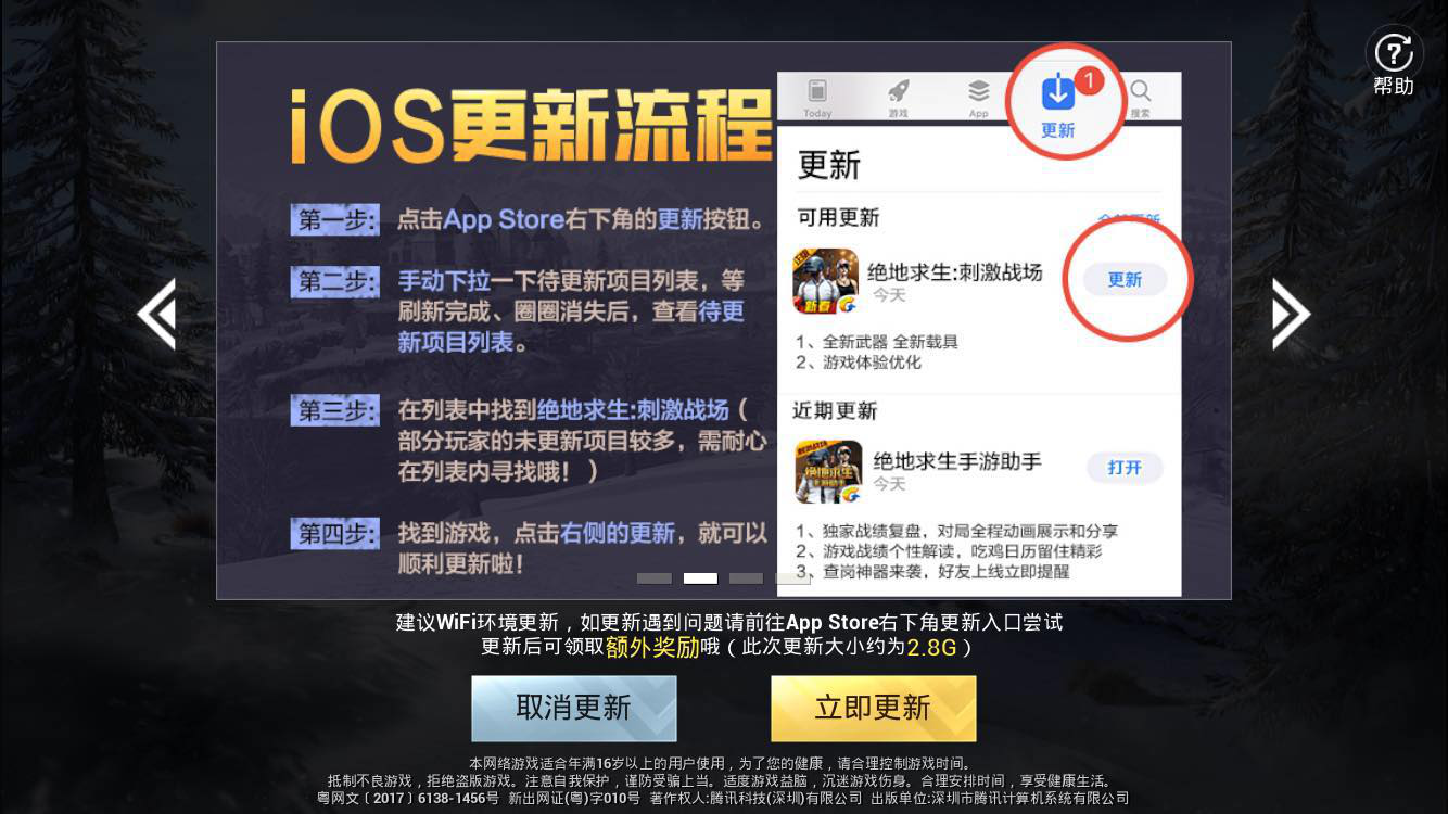 本次更新为非强制更新。如果网络不合适,鸡友们可以选择暂不更新,仍然可以玩旧版本游戏。