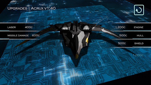 剧情对话结束后就会到上图的界面,这是我们需要操控的战机各项属性的具体数值,点击Laser可以选择调整飞船的激光数值,400是最大消耗的能量资源也更多,可以视情况适当调小;Missile Damage是导弹的伤害数值,可以点击进去更换导弹种类,但游戏一开始只有一种导弹所以这里暂且不管;Engine可以调整飞船的飞行排量、速度以及改装配件,当然,游戏一开始是没有多余配件可以改装的;点击Hull可以改动船只外面的皮肤;点击Shield可以调整飞船的护盾;