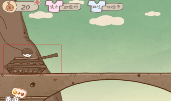 这个看起来就不怎么坚固的桥肯定是不可能撑住一个坦克的重量,那该怎么办呢,在坦克车快要到达桥时,点击小人,小人就会从坦克里跳出来,再继续点小人,他就轻轻松松的走过桥了。