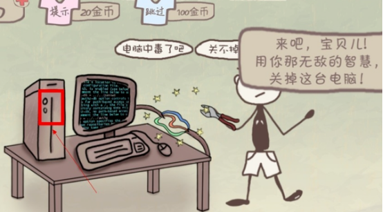 游戏第一关就要开始你无厘头的思维来去玩这个游戏了,就像老爹说过的一句话,要用魔法对付魔法。第一关一开始就出现了极具嘲讽的几句话:电脑中毒了吧,关不掉了吧。只见旁边的小孩拿着工具,电脑线也露在外面,红绿蓝,这是拆弹专家吗?不,关闭电脑,最简单的方法不是按住主机的按钮吗,按钮一按,这一关就结束了。