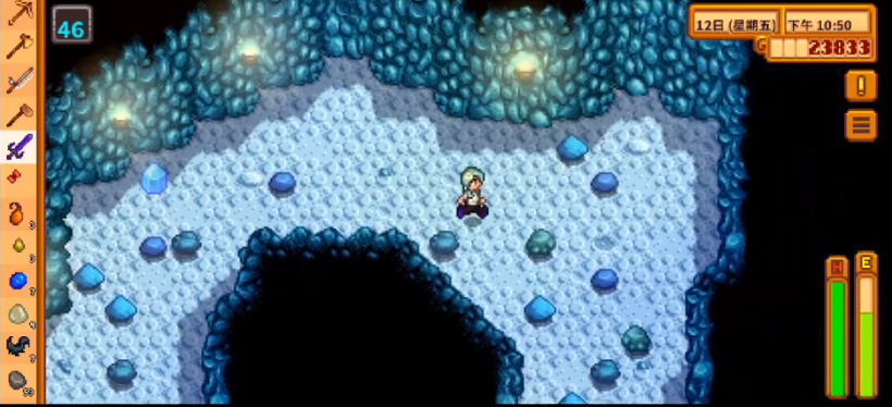 接下来就是下矿,建议玩家进入一层之后,直接用梯子,一直用梯子下层,差不多到八九十层之后,再进行炸弹来炸矿,有洞口就下,没有就用梯子,最好不要浪费时间打怪,直接炸弹炸矿,然后冲层。游戏中有时停的机制,玩家利用好这个机制一天炸一组铱矿是很容易的,不过操作难度有点大,建议玩家一定要多尝试!