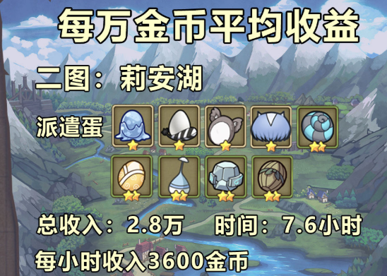 首先在游戏中,玩家可以通过在市场购买各种魔物蛋,然后进行孵化和派遣赚取金币,不同的地图能够买到的魔物蛋也各不相同,首先金币效益最高的地图就是图一了,新手玩家进入游戏的第一张地图,用来购买蛋然后进行孵化派遣,赚到经济效益最高,但是第一张图孵化时间很短,比较适合特别肝的玩家,每次孵化时间一到就上线继续收取孵化,但是如果忘记收蛋的话,就比较亏效益了。