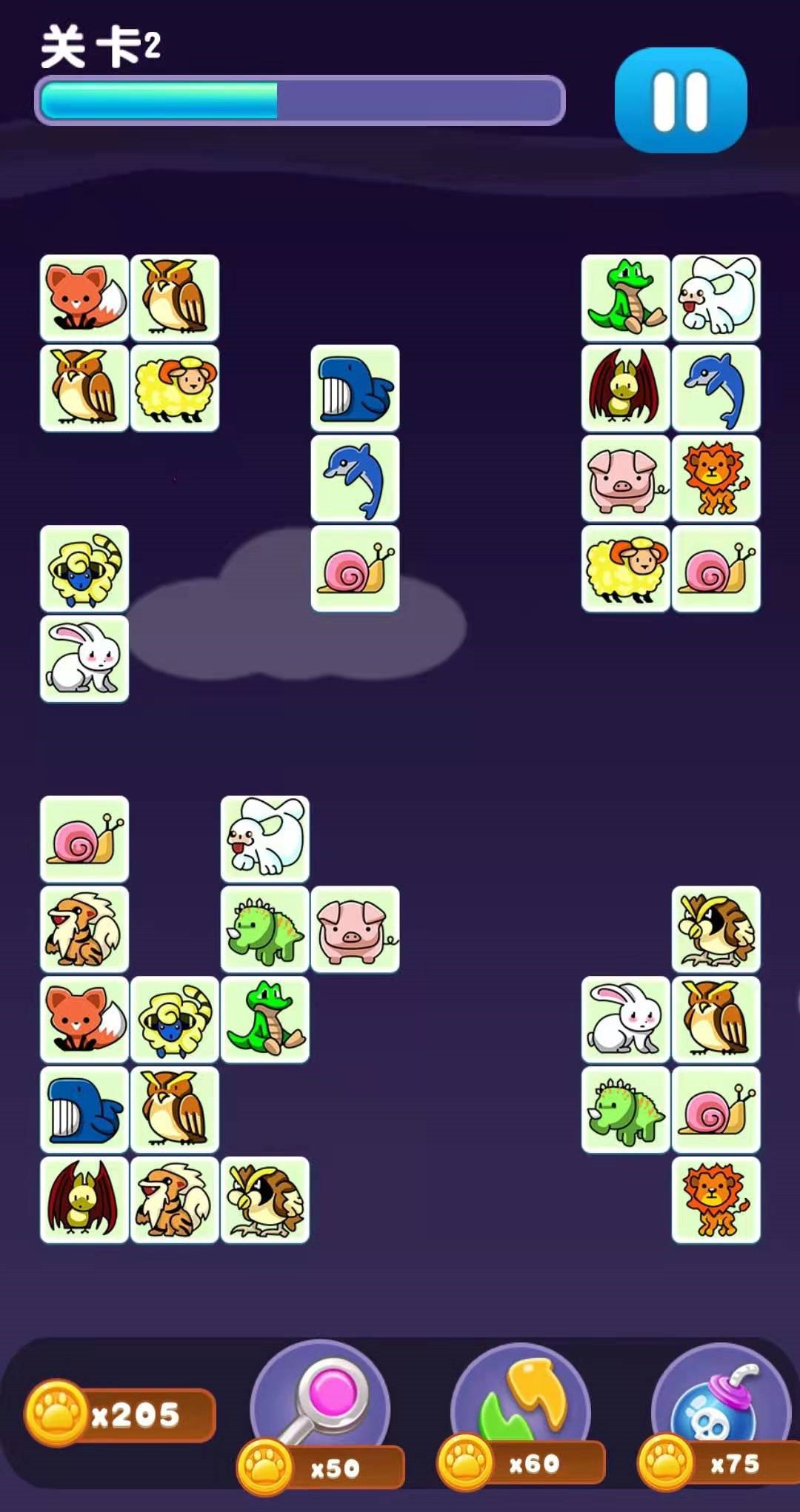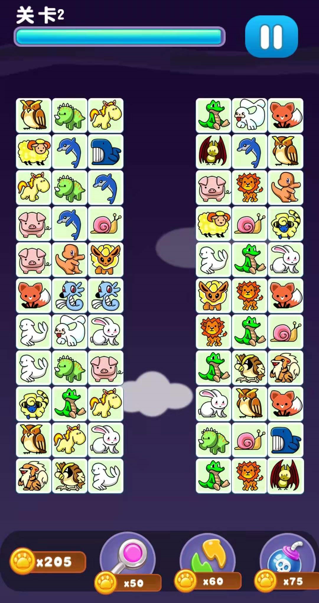 上面有时间的进度条所以玩家需要不断的消除小动物卡牌,停顿时间久的话时间流逝的也就更快了。小编每次都是还剩几队小动物没有消除完时间就到了。后来才发现这个是需要一定的技巧的,每消除一对一样的小动物之后时间进度条会多还给玩家一点时间,所以游戏一开始不要将两队相邻一样的小动物直接全部就给消除完了,先去找比较难找的小动物消除,等时间不太够的时候再去消除两个相邻并且相同的小动物,恢复一点时间再去寻找下一对。