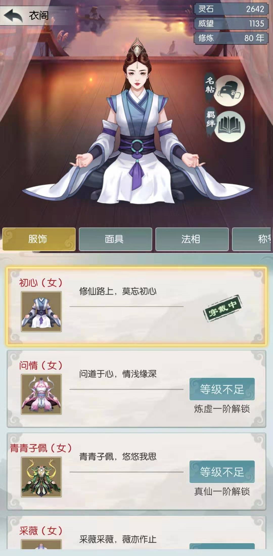 储物袋还可以看到我们人物的衣阁,点击衣阁可以穿戴不同款式的衣服,最重要的是这里的法相还有称号如果有的话一定要记得佩戴或者使用,这些都是可以获得额外属性的!
