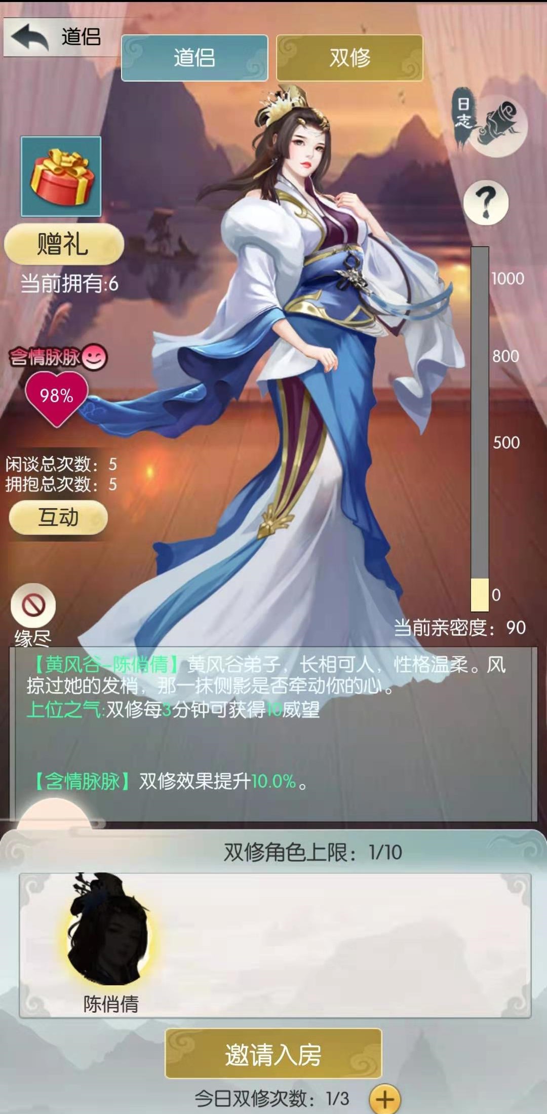 最后就是道侣了,道侣里面有许多的人物我们可以在奇遇去结识,提升好感度就可以与这个小伙伴双修了,可以给这位道友赠送礼物提升好感度,还能与道侣互动比如说交谈赠送情物还有拥抱这些都是可以提升好感度的,好感度达倒一定的度数就能道侣双修,双修还可以获得许多的威望值。没有双修的道侣只能拜访切磋还有赠礼。