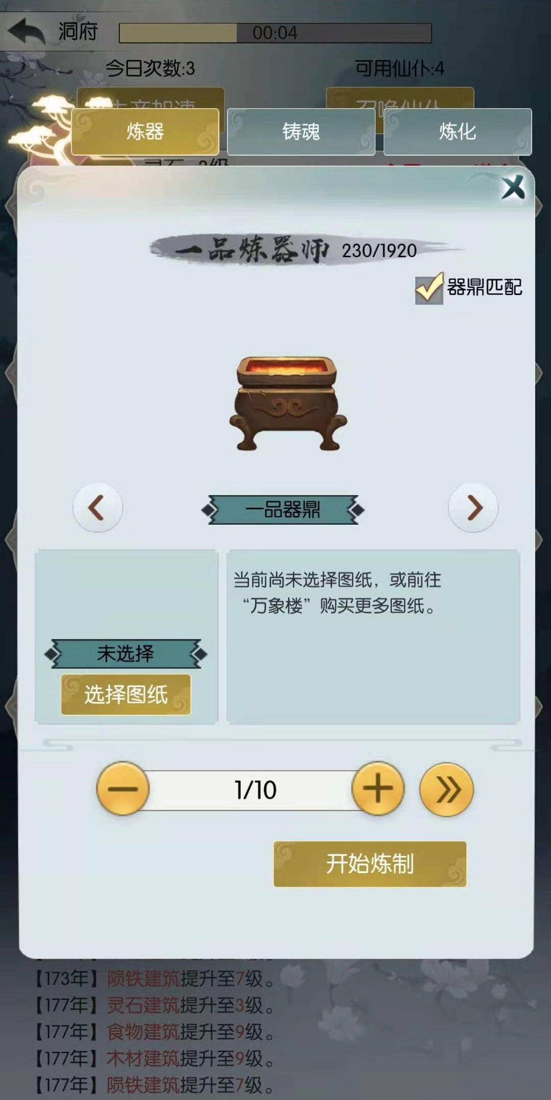 炼器的操作也是差不多的,先去坊市购买器鼎和图纸,然后去使用这些器鼎和图纸,上次说到的升级装备就是在这个炼器里面,但是我们需要将装备卸下来,然后再去炼器里面炼制升级这些装备可以增加不少的属性,然后炼器跟炼丹的顺序就是差不多的了。