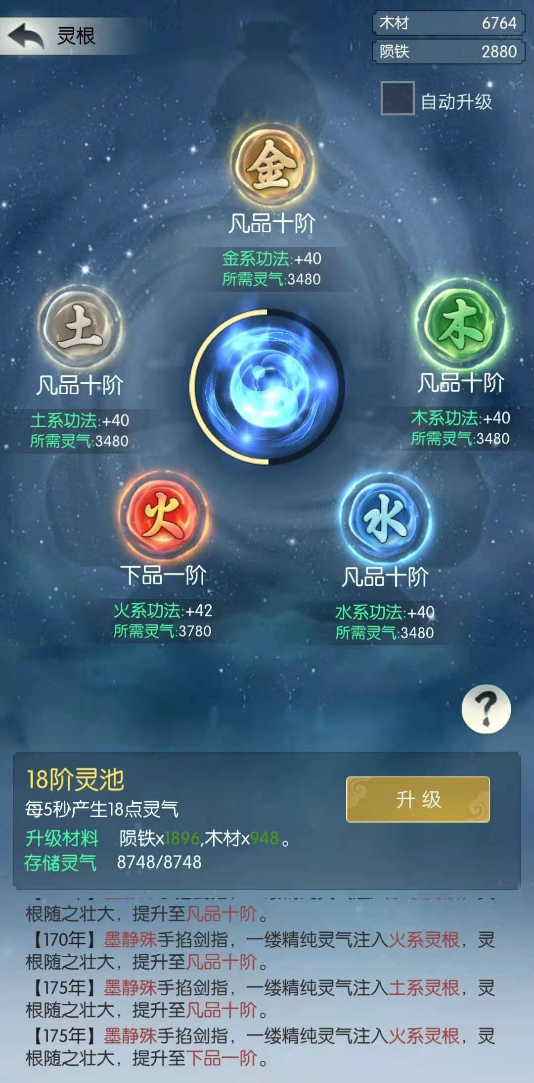在《无极仙途》游戏里面,还比较重要的是灵根和功法这两个板块。来一起去灵根模块看看,灵池需要需要消耗木材以及陨铁升级,提升灵池等级后可以增加储存灵气的上限,提升每次灵气的产出量,还有灵根的等级这个等级是需要消耗灵气去提升的,升级后可以增加对应属性的功法额外属性,等阶越高的话加的属性也就会越多了。