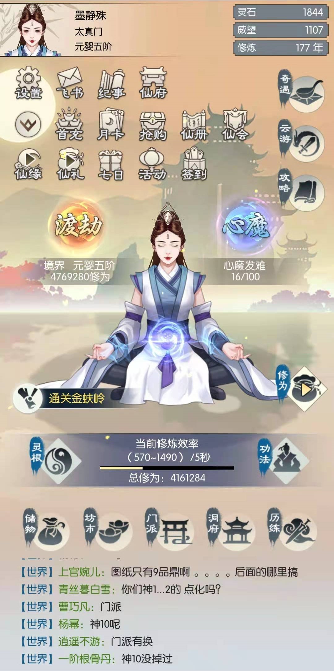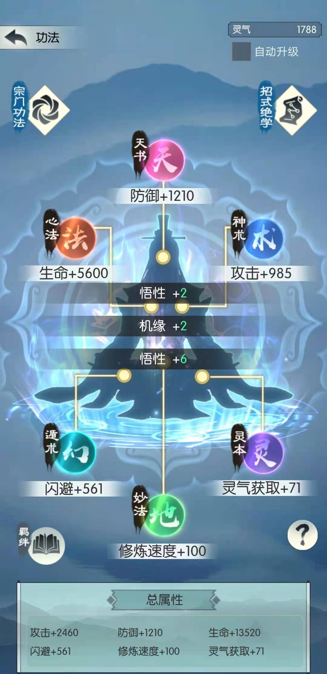 再就是功法了,神术属于增加攻击、天书可以增加防御、心法可以增加生命、遁术属于增加闪避、妙法属于增加修炼速度、灵本属于增加灵气获取。这些功法的来源首先可以去门派学习,还能够在坊市花费灵石或者仙玉去购买经书学习修炼功法,后期酒馆完成委托任务可以获得功法,还有游历和活动礼包中可以获得一些功法。