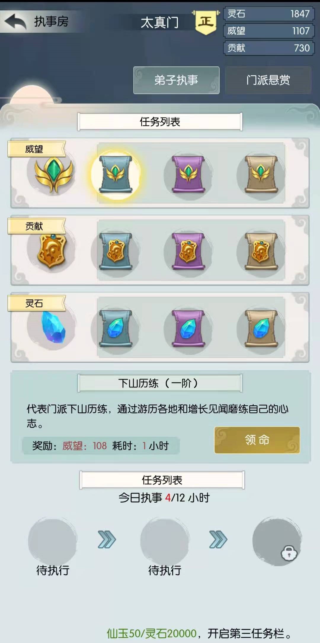 在门派悬赏里面,下面有悬赏任务分别可以获得威望、门贡、还有灵石,小编每次执行的都是门贡任务,在这里小编需要提醒玩家们,比如想要获得门贡,需要点击不同的门贡值任务,有一个小时的有两小时的,但是小编每次选的都是一个小时的门贡任务,因为一个小时的可以获得八十四门贡,但是两个小时只能获得一百二十六的门贡值,所以这么算下来还是一个小时一个小时的点门贡值比较多。