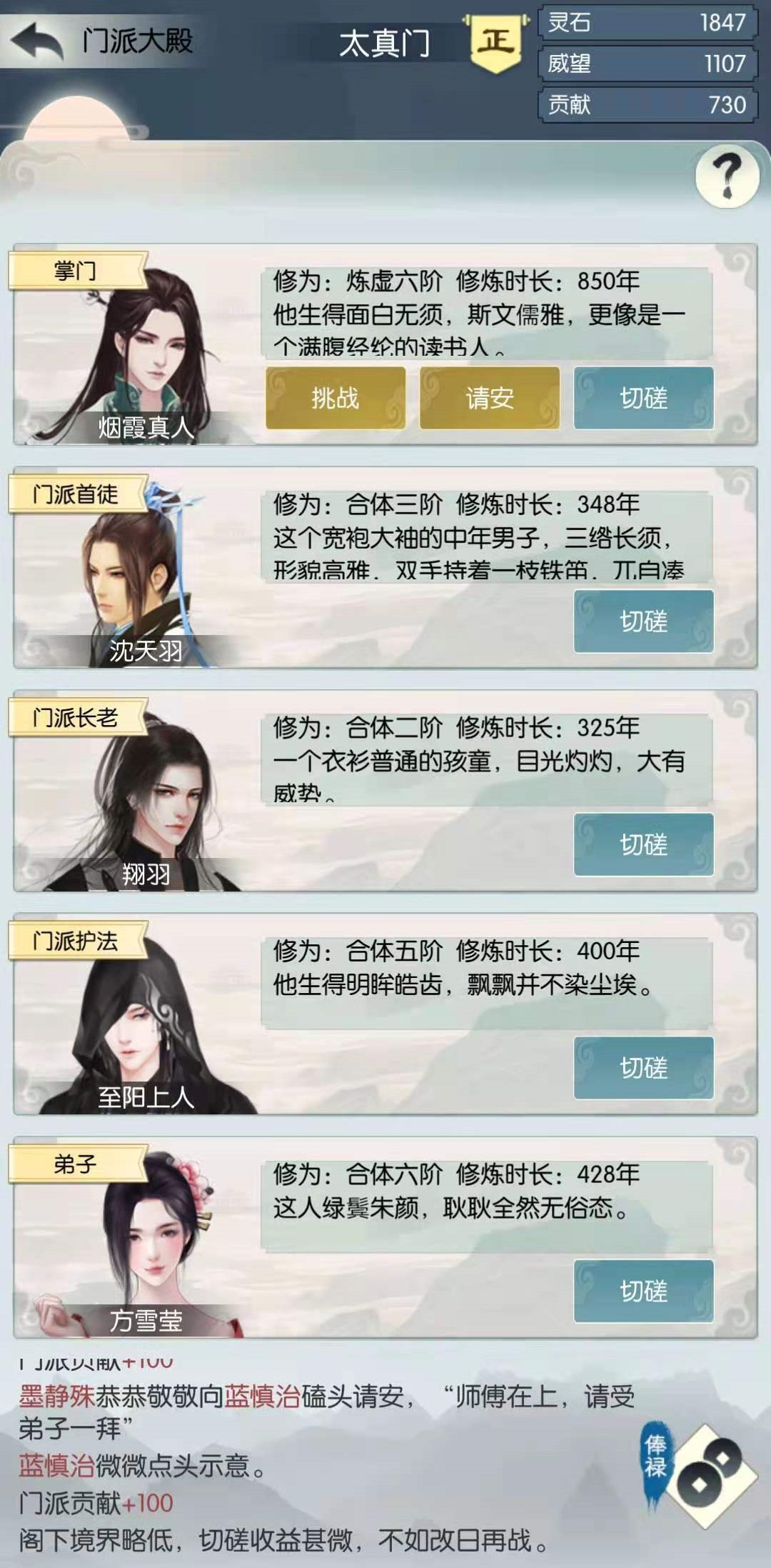 接着就是《无极仙途》游戏门派的门派大殿了,我们能够看到这里有掌门、门派首徒、门派长老、门派护法以及弟子,刚刚说可以通过对帮派的贡献值去提升自己的职位,在这里还可以挑战这些职位的人获取这个职位,比如小编想要当护法就去和护法切磋,然后去学习护法能够学习的绝学。当然前提是玩家们可以打得过这个职位上的人,获取这个职位。玩家们还可以每天通过跟掌门请安获得一百的门贡值,最下面还有每天的俸禄可以领取。