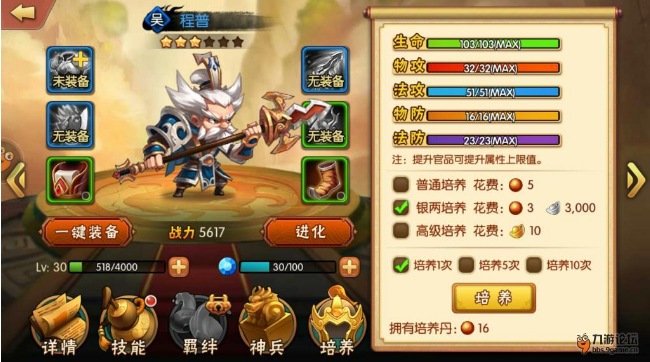 玩家可以通过神兵锻造来提高武将的品质,玩家可以通过在时空塔选择你想要锻造的武将,完成战斗之后就可以获得这个武将的碎片了,玩家也可以通过神秘商店来获得武将碎片,玩家子啊提升武将的时候,要注意,武将的强化等级和自身的等级是不一样的,并且强化的等级是不能超过武将本身的等级的,所以玩家可以每十级进行一次突破,这就需要消耗大量的材料了,所以每天的时空塔是一定要打的,绝对不能错过!