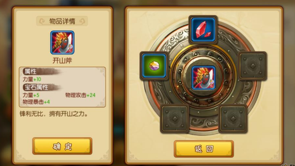在这款游戏中,宝石也是提升战力的关键,不同的宝石也被分为:力量石、灵力石、智慧石、物攻石、法攻石、力攻石等等。玩家可以在铁匠铺中购买各种宝石,然后使用2颗相同等级的宝石和一个精铁进行合成,可以获得更高一级的宝石。然后获得强大宝石之后可以镶嵌在装备上,每个装备可以镶嵌5个宝石哦。