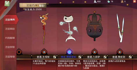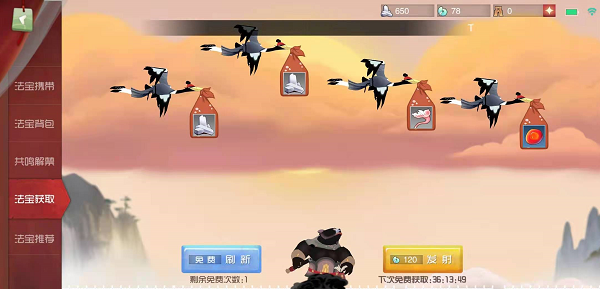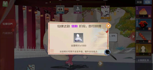 法宝的获取方式非常简单的,玩家可以在法宝界面中通过黑熊怪射击,使用120的仙币完成一次法宝获取,有着法宝和法宝碎片的奖励。玩家也可以直接在法宝背包中解锁自己需要的法宝,所有的法宝都是只需要800的法宝碎片直接接受,玩家还可以通过法宝碎片来给他们升级,使他们变得更强。法宝碎片的获取方式也是很简单的,在仙缘中玩家可以通过凡间游历派遣自己的英雄探险,就可以获得法宝碎片了,当玩家将英雄的仙缘到达一定的等级同样也有丰厚的碎片奖励,所以还没有法宝的玩家快去挑选吧!
