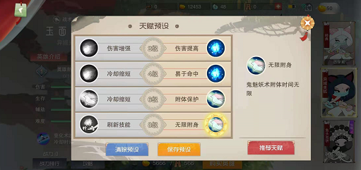 由于在闹闹天宫中没有装备可以为我们提供冷却缩减,所以在玩家选择天赋和法宝的时候就要多用些心思了。在天赋的选择上有两种可以选择的玩法,一种则是全力拥有更强护盾的玩法,一种则是冷却缩减,让我们能够对敌人更快造成魅惑。这两个天赋都是在玉面狐狸的大招上改变的,玉面狐狸的大招拥有着很长的施法距离,在使用技能后,玉面狐狸会向指定方向冲刺,在触碰到敌人后,则会对敌人造成短暂的魅惑,而触碰到队友则会附身在队友身上,并为队友添加一层护盾。这样的设定是不是很熟悉呢?没错就是他了,不过玉面狐狸附身队友的时间是优先的,等到时间过去,玩家就会自动掉出来,所以在天赋选择上八级所选的则必定是无限附身了,这个效果就可以让玩家附身的时间没有限制了,只有在队友的护盾被打掉后才会掉出。