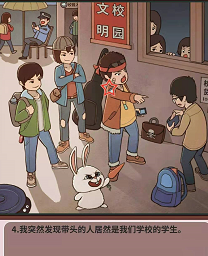 在第三题中老师发现了一个更加严重的事情,有一个学生居然还带了危险物品,小编在第一次寻找的时候也是碰了壁,毕竟放在墙边的骷髅图案的背包看着就不太好,但很明显他只是一个普通的背包,想到小编的学生时代,也有很多为了装酷穿带一些骷髅图案的物品,但是也不能断定这个人就是大恶霸了。在第四题中就需要玩家仔细观察了,班主任是怎么样看出来带头的学生就是我们学校的人呢,咋后面保安的位置,我们可以看到学校的标语和校徽,而这个学生衣服上也是有我们的校徽,看我要怎么样教育他了。