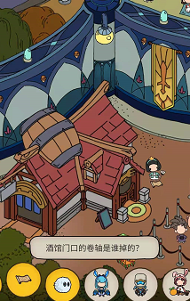 首先要找的就是我们的神秘卷轴了,根据卷轴的文字提示,我们可以知道卷轴掉落在了酒馆门口,所以玩家找到酒馆是寻物的关键,由于酒馆肯定是一个大屋子了,所以我们可以将场景缩到最小,这样就能拥有更大的视野,看到更多的建筑了。而我们的酒馆就在大门外的左边,可以看到房子上有一个很大的木桶标志,这就是我们的线索位置了,而卷轴就在酒馆外拿着扫把的女孩脚下。