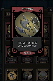 对于骑士来说光有武器没有攻击肯定是不行的,而我们的攻击牌可以是为我们加护甲的功能牌也可以是带有穿刺攻击的高额伤害卡牌,当然这些卡牌都不要通过商店来购买,毕竟商店可以买到的装备每一个都是很贵的,在宝箱中或角色升级获得的装备都是可以拾取的,其中我们最重要的一张装备牌就是致命武器这张牌了,他可以在我们装备武器越多的时候造成更高的伤害,可以说是为武器大师专属打造的。
