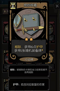 行动力同样也是我们想要的属性,这个属性对于船载火炮打法的女骑士来说一到两点就已经足够了,在卡牌构建中,女骑士必备的行动牌则是可以随机获得装备或装备两个基础装备的短兵相接和绝妙收藏了。而小编就因为自己的粗心选择了猪皮背包这个事件,在装备槽上有很大的提升,但损失的确实没有了行动力,遇到这种情况时玩家也不用太过担心,我们只需要祈祷能在神秘商店买到塔盾这件装备,将这件装备作为初始携带的装备就可以让我们在每一个回合都获得行动力了。