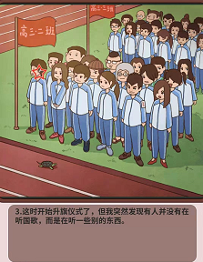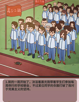 新的一周都是由一个朝会开始的,想闭玩家们也都有经历过早会,升国旗以及领导讲话这样的活动,在学校中穿着整齐的校服是最基本的准则,而在一周一次的朝会上还有人没有穿校服完全违反了学校的校规,玩家需要找到哪个没有穿校服的学生,揭穿他。这个学生的位置也是十分隐蔽的,不过不要专注于那个戴眼镜经常犯事的学生了,今天他的校服还是穿上了的。在高三二班的最后一排的右边第二个学生,穿着绿色的衣服,站的虽然很隐蔽,但作为站在前面的班主任还是一眼就发现了不对。
