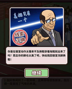 而在第二题中,班主任灵敏的嗅觉也发现了问题,在附近闻到了脚臭的异味,这一点文字提示就能让玩家从他们的鞋子入手了,没想到戴眼镜的学生还是有问题所在,就是他穿着凉拖鞋上学,这样的穿着也是在学校中不允许的,而且脚臭这么严重是没有洗脚吗?点击戴着眼镜的学生穿的拖鞋揭露他的恶习。经过我们的观察,我们还发现有人居然在奏国歌的时候在听其他的东西,在国歌面前应该保证绝对的肃立尊敬,点击第一排最左边的学生,他居然还在听着蓝牙耳机,那手机也要一起没收了。