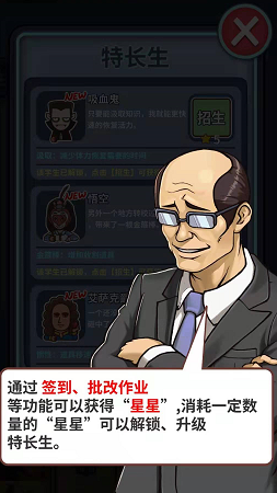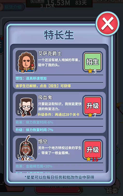 在玩家通过十八关后,就会解锁特长生的玩法同时还会获得吸血鬼这个特长生,别看他长得一副黑眼圈但在教室里学习还是非常认真的。玩家需要通过星星来解锁特长生,同时还可以通过星星来给他们升级,根据特长生所带来的增益,他们升级所需要的星星也是有所不同的,每一次升级都会让下一次升级所获得星星数量增加。玩家获得星星的方式还是很多的,在每天进入游戏的签到或完成各种特定的任务都会获得大量的星星,来帮我们给这些特长生升级,解锁更多的特长生。