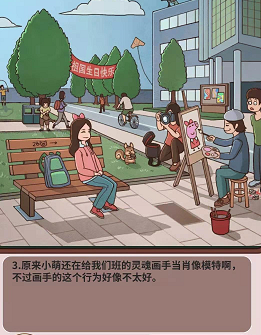 在第三题中我们还发现小萌还在跟一位同学作模特,果然好看的女孩子都是非常受大家欢迎的,可是我一看这个画手的行为就有些生气了。这一题还是有些难度的,是不是有很多玩家都选择了点击他画的小猪佩奇。不过老师不会约束同学们的适当玩耍,但是在你旁边颜料都撒了一地,乱丢垃圾这样的行为就是非常不好的,作为学校老师的我们一定要给他警告,让他不能这样做了。当我们向远处看去,发现还有人在破坏草坪,这也是非常不和谐的一面,点击远处在草坪上跳绳的学生,随意践踏草坪就是非常不好的行为,这个学生都在反复践踏绿草的生命上了。