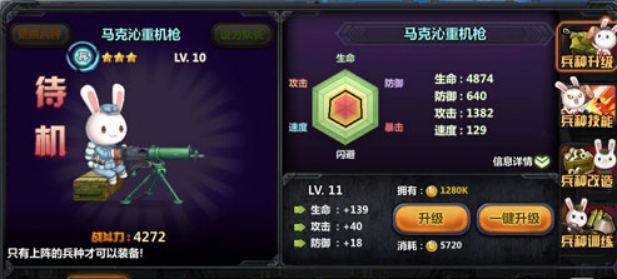 《那兔之大梦国》绿色套装:过渡装备齐全,只有一级,不改装。蓝装:前期推图装备,前期跟随指挥官级别(25级之前)。当千千在早中期(25级以后)开始供不应求的时候,考虑改变团队属性后升级。后期地图开始提供紫装时不要升级,等待紫装更换。只要转型是+1或者+2,浪费就更多了。紫装:后期主要装备。小千千多的时候,要按照40级之前的级别分配。点击团队属性后,装备升级,主力兵种优先。紫色套装换成+4就停了。如果橙色套装不是一直都有,那么+5,优先顺序是武器>护甲>补给>配件。橙装:目前终极装备全是优先点,改造慢。一般到+5就停了,+6成本太高。其他设备加固后再考虑。