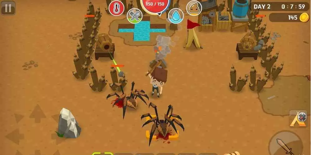 如果天黑之前我们仍然没有找到水池,就重开这一局重新闯关第二天,找到水池之后就放置两个篝火用来取暖,还要布置两个陷阱预防有怪物骚扰你;接下来再利用工作台把我们的净水器以及铁桶制作出来,用来补充我们身体的水分;前期我们只要制造两个就能非常保险,到了游戏后期要发展到五个,每个净水器用完之后我们还是要收集到背包之中,不要丢掉。