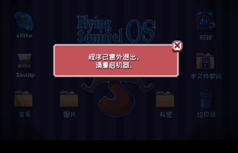 我们可以看到在错误提示框的右上角有一个关闭按钮,这时我们点击这个关闭按钮,提示框随即被关闭,游戏画面上出现了一个极其复古风格的桌面,桌面上面放着垃圾桶、时钟、skite、一个压缩文件、三个文件夹以及一个被命名为本文件禁阅的被上了锁的文件夹。这个时候游戏ai提示我们不应以任何理由打开禁阅文件夹,但是我们就偏要打开,就是要和游戏ai对着干。打开禁阅文件夹的事可以先放一放之后再说,我们可以先尝试打开桌面上的图标来试试看到底会发生什么事。