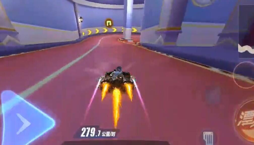 要注意的是在通过这个弯道的时候我们需要提前使用一个停滞漂移的技巧接上快速出弯的技巧,这样能够让我们的车速保持一个比较平稳的状态去通过这个弯道,然后我们使用快速出弯之后接上氮气卡以及双喷的技巧来触发CWW喷进行提速就可以了。