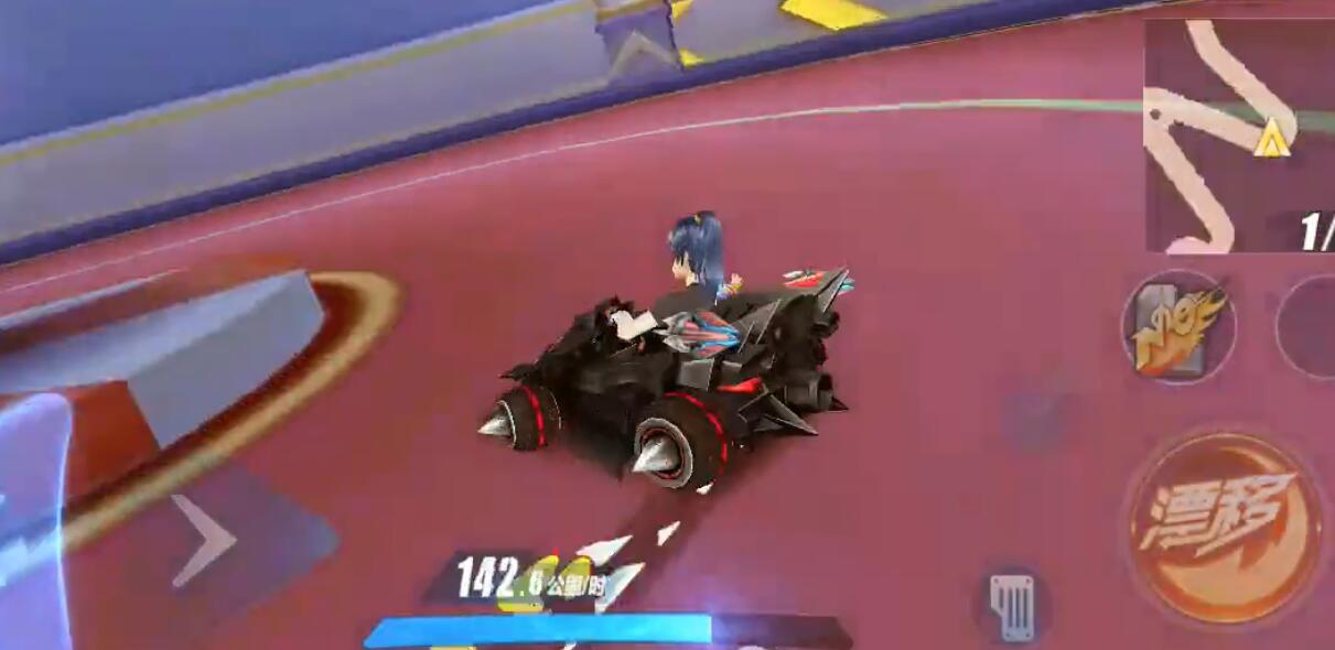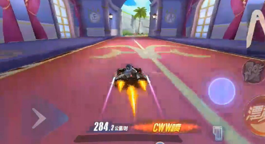 通过这个近道之后我们会来到一个直行通道,这里我们什么都不用做,在直行通道走完之后会来到一个U型的大弯道,在这里我们使用到停滞漂移后接上快速出弯的技巧,随后接上双喷以及氮气卡来触发到CWW喷就可以了,这样能够为我们的车辆提速且方向不会发生太大的偏移。