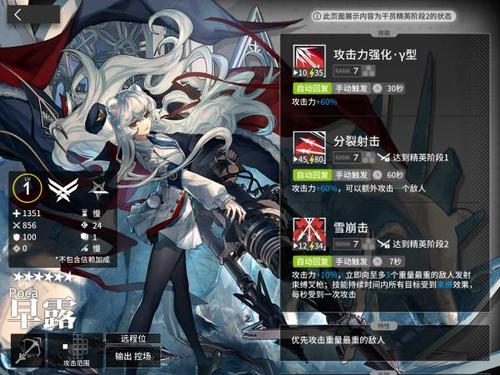 早露是明日方舟游戏中最近推出的较多狙击甘愿中的一员,她作为六星的单体狙击甘愿,是属于高贵的特种狙击系的干员,这类干员大多是攻击范围广,攻击力爆炸,同时也有较常间隔的攻速补正。在横向对比上早露本身的攻击力和生命值等基本属性是很不错的,特别是在攻击力的白值上更是可以说首屈一指的存在。
