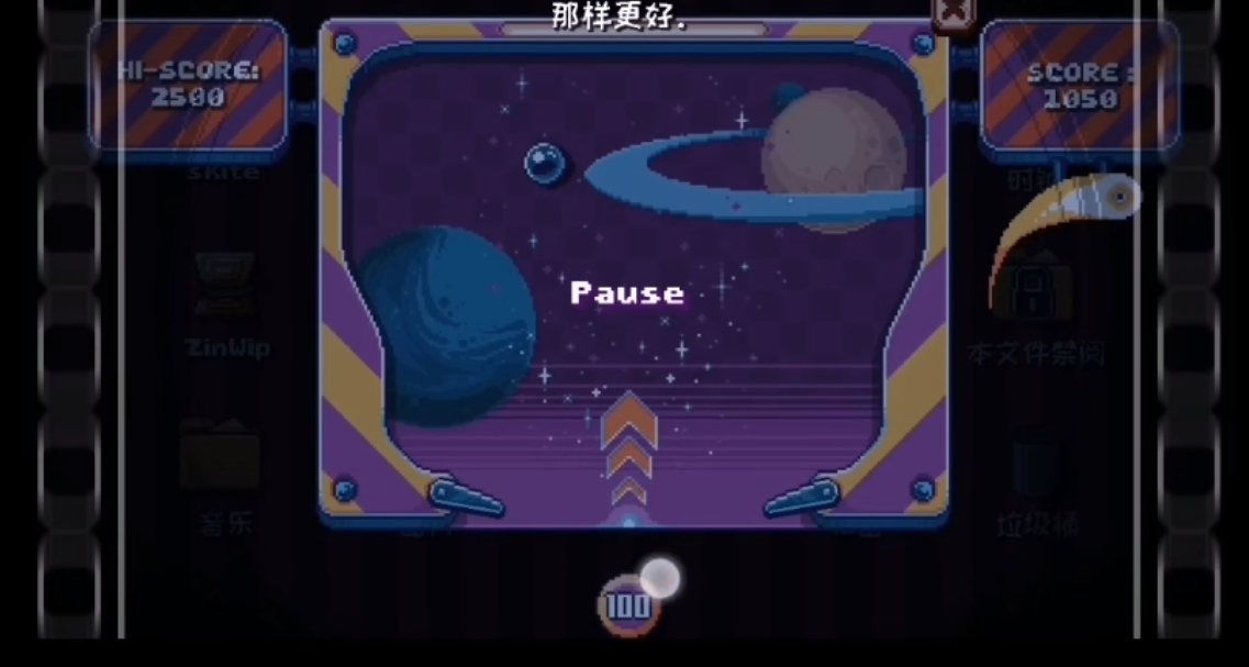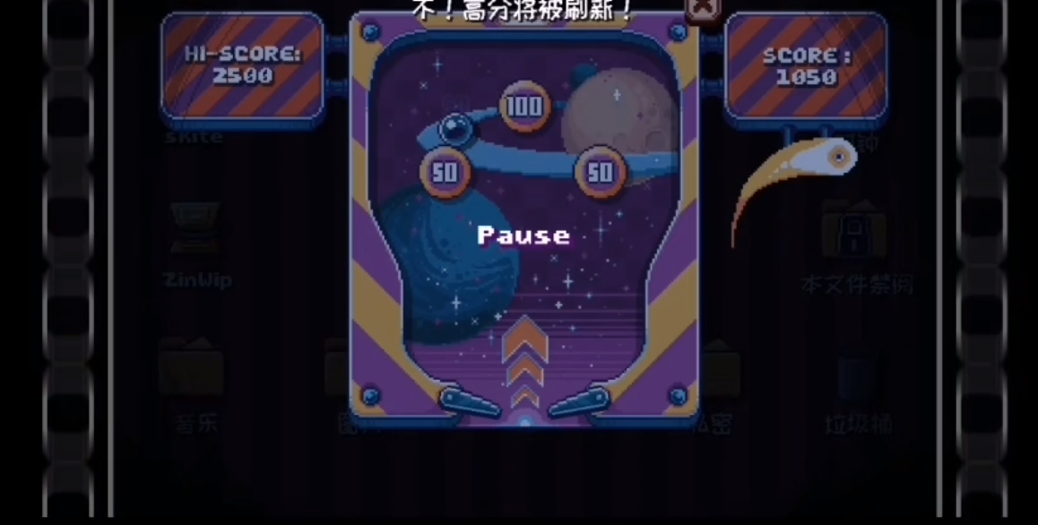 等游戏发球,我们就可以开始游戏了,三维弹球的游戏上方有三个桩子,这三个桩子有着分值,分别是两个50分的桩子和一个100分的桩子,100分的桩子在两个50分桩子的上方,我们只需要将小球击打到这三个有分值的桩子上就可以得分了,但是如果小球掉落到位于游戏正下方的缺口,这时候就会被系统扣50分,大家尽量小心不要让小球掉落到缺口里面。经过一阵的游玩,我们的游戏分值达到了1050分,这时候游戏突然被暂停了,原来是游戏ai给我们按了暂停键,他惊恐地说:不!游戏高分将被刷新!随后游戏界面突然开始晃动,经过一阵晃动后,三维弹球小游戏中三个可以得分的桩子也掉了下来,两个把手的兼具也变得非常的款,这个狡猾的游戏ai,不光断了我们唯一的得分途径,还给我们加大了游戏难度。