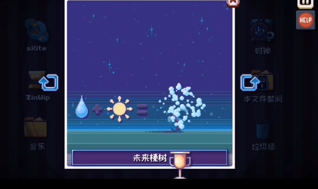 我们仔仔细细的观察这张图片,可以在图片中发现一个公式,水加阳光等于榛子树,那也就是说,要想得到一颗成熟的榛子树必须要得到水和阳光两个条件,现在我们只在榛子树上浇了水,所以榛子树才不会成熟,还差一个阳光的条件才可以让榛子树成熟。我们现在必须要想办法找到阳光才可以。现在我们关闭未来榛树图片,然后再关闭图片按钮回到桌面,想想用什么办法才可以找到阳光让榛子树成长。我们发现,桌面右上角的时钟到现在还没有被解开过,而我们之前得到的线索好像是可以解开它的。