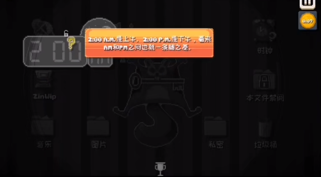 那么我们应该怎么才能修改这个钟表的时间呢?这时候我们需要点击游戏界面右上角暂停键下方的帮助按钮,看看系统会不会给我们一些提示。点击右上角的帮助按钮后,屏幕上出现了一条提示,200 A.M.是上午,200 P.M.是下午,看来 A.M.和P.M之间也就一条腿之差。这时候我们就知道了具体怎么样才可以修改系统时间了。根据提示信息的意思,字母A比字母P多了一条竖杠,只要想办法把字母A右下角的那根竖杠去掉,就可以实现把系统时间调节到下午去了,现在我们就回到时钟界面想办法来把字母A右下角的那根竖杠去掉,我们尝试点击字母A右下角的竖杠,看看是否能将这根竖杠去掉。
