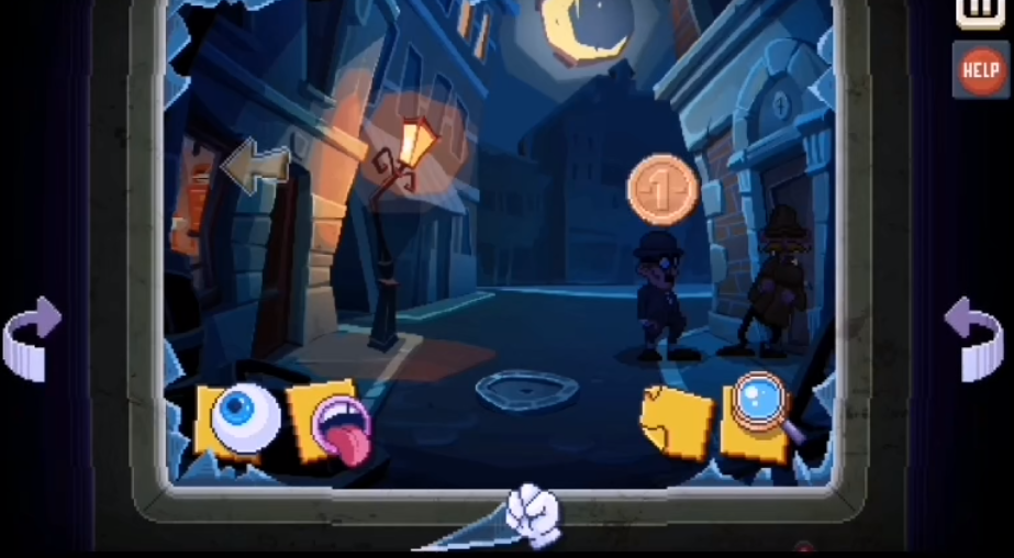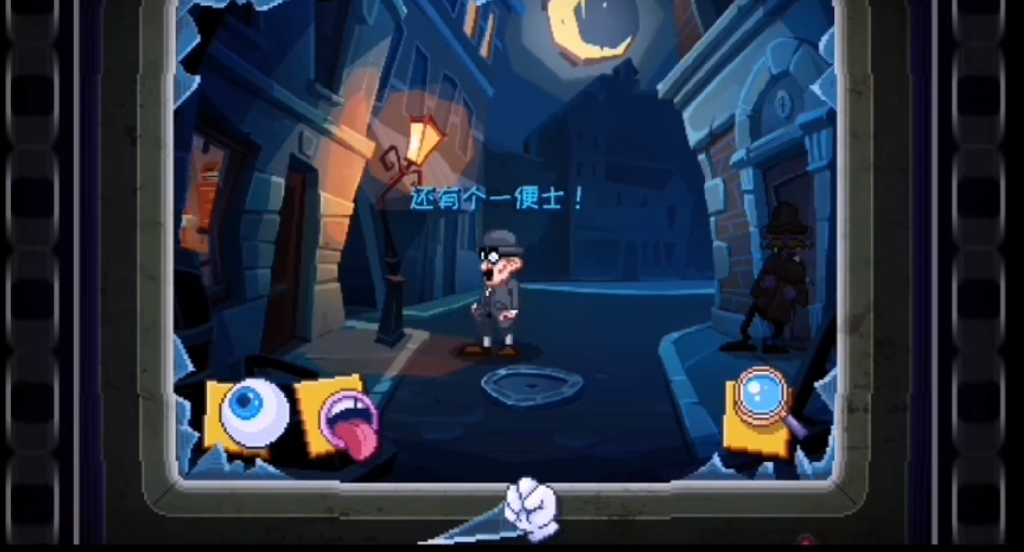 这时候我们需要点击一下地面上的井盖,发出咚的一声引起夏洛克福尔摩斯的注意,这时候他会向后面看,就会发现掉落在路灯脚下的一枚硬币,随后他走上前,将这枚一便士的硬币捡了起来,这个时候我们发现这枚一便士硬币在夏洛克福尔摩斯的头顶闪烁,现在我们需要操作拳头去拿到夏洛克福尔摩斯头上的这枚一便士硬币。那么这枚一便士的硬币到底能起到什么作用呢?这个时候我们返回福尔摩斯的房间,回到老旧电视屏幕的主界面,然后我们点击游戏界面左边的切换按钮,切换到电视机扬声器的界面,这时候我们发现扬声器上面的四个螺丝是平口的,到了这一步就通过了这一关了。