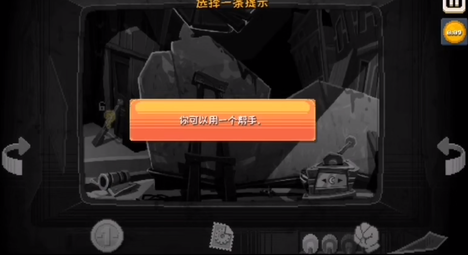 这个时候我们就要想办法让连接到这个开关的设备工作,我们可以尝试寻找房间内的线索或者使用手上现有的道具来修好链接开关和设备的电线。但是经过了一番尝试之后,我们并没有办法让连接到这个开关的设备工作。这个时候我们就需要求助系统提示了,现在我们再次点击游戏界面右上角暂停键下方的提示按钮,就可以得到一条提示了,提示信息是:你可以用一个帮手。帮手?手?我们正好就有一个手啊,那我们现在一定就是要用这个拳头去做点什么的。