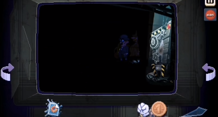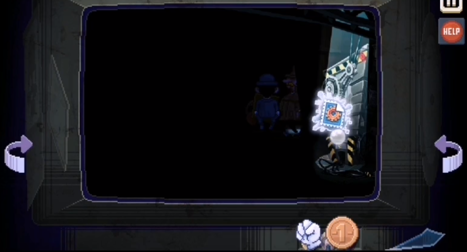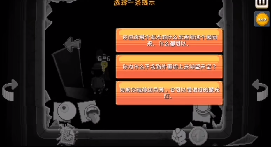 回到福尔摩斯和华生所在的漆黑的房间内后,我们可以看到提示按钮亮起,这就说明我们可以获得下一条提示信息了,提示信息是:如果你能移动月亮,它可以是很好的聚光灯。也就是说房子外面街上的天空上面的月亮是可以移动的,那么我们需要怎样做才能移动月亮呢?接下来我们点击游戏界面的左右切换按钮,直到切换到一个黑暗的房间内,这个房间内有着一个奇怪的装置,而且游戏ai提示我们这个奇怪的装置上面缺少了一个齿轮。这时候我们之前从信封上抠下来的邮票就派上用场了,这个邮票上的图案正是一个齿轮,并且我们还在邮票的背后弄上了口水,所以我们现在可以直接拖动邮票到奇怪装置的齿轮缺口处,就可以把邮票粘上去了,这时候即可通过此关。