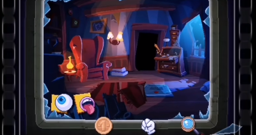 我们这个时候点击轨道车,将轨道车拖动到游戏界面的电视显示屏中的片场的右边,将轨道车拖动到游戏界面的电视显示屏中的片场的右边之后,我们就可以看到一个被轨道车挡住的平口螺丝了。平口螺丝当然是可以用一便士的硬币拧开了,我们现在再操作一便士硬币,将这个平口螺丝给拧开。我们将平口螺丝拧下来之后可以看到被螺丝固定住的东西掉了下去,这时候我们再返回福尔摩斯的房间,这时候可以发现我们已经得到放大镜了。