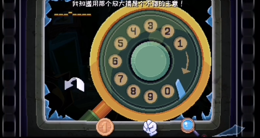 我们刚才从夏洛克福尔摩斯口袋中偷来的放大镜还从来没有使用过,那我们现在就需要找一找这个从从夏洛克福尔摩斯口袋中偷来的放大镜到底能起到什么作用吧。这个时候我们可以点击从夏洛克福尔摩斯口袋中偷来的放大镜,然后拖动这个从夏洛克福尔摩斯口袋中偷来的放大镜,将放大镜拖动到月亮旁边的那个装置上面,这个时候就可以看到被放大镜放大的画面了,原来我们正在用放大镜观察的这个地方是一个老式电话,上面显示着零到九的数字,是老式电话的拨号盘,但是这部老式电话的拨号盘上面的按钮按下去的时候并没有效果。那现在我们就需要去使用从夏洛克福尔摩斯口袋中偷来的放大镜来寻找别的线索了。