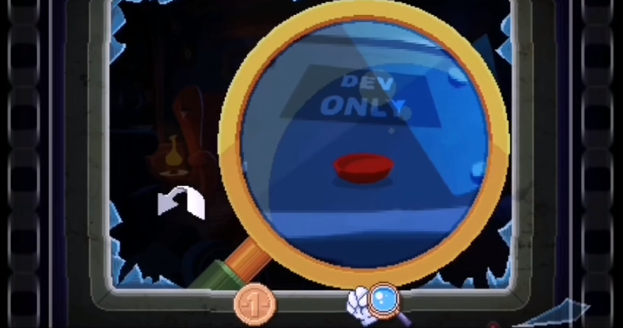 现在我们回到夏洛克福尔摩斯的房间内,细心地小伙伴应该可以看到房间内的地板上有一个非常突兀的铁板,铁板上还有一个红色的东西,这个时候我们就是用放大镜去观察这个带有红色小点的铁板。使用放大镜去观察铁板后可以看到,铁板上红色的小点原来是一个按钮,并且在按钮的上方还写着DEV ONLY,仅限开发者使用的字样。