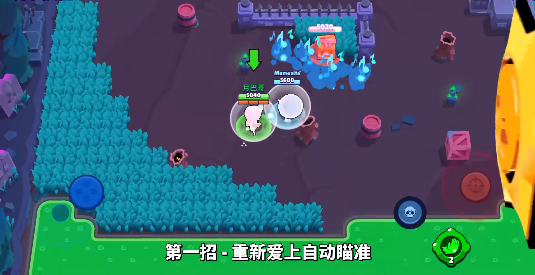 第一招:重新爱上自动瞄准。在荒野乱斗中,最萌的萌新只会用自动瞄准,而小编建议大家多练手动瞄准,因为子弹有飞行时间,长手英雄必须用手动瞄准才能打中移动中的敌人,例如巴利或者布洛克。但其实最顶尖的玩家并不会一味地使用手动,而是会看情况灵活切换手动和自动,这是因为每一种攻击取决于他们飞行速度的不同,都会存在一段用自动攻击敌人也躲不开的范围,并不是零距离才能使用自动攻击,你的子弹飞行速度够快,自动攻击的有效范围就越大,子弹飞行速度越慢,这个范围就越小,这一招对于某几个子弹速度快的英雄是特别有用的,比如说吉恩的大招和普攻。从中距离开始使用自动瞄准,是可以极大程度的提高命中率的。
