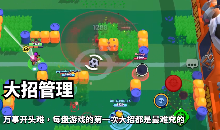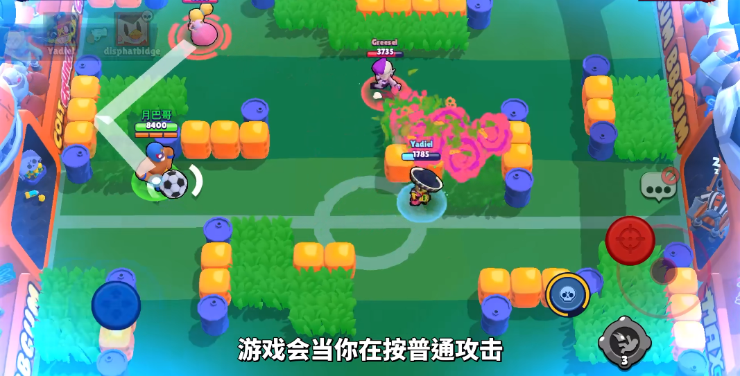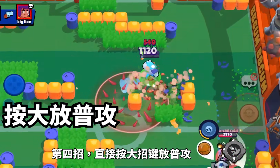 第二招:直接按大招键放普攻。我们经常会遇到一种情况,就是两个游戏单挑,大招都没有好,这个时候谁先放出大招谁就能获得胜利,面对这种情况有一个操作可以保证我们瞬间放出充能好的大招,这招就是直接按大招键放普通攻击。在荒野乱斗中,如果大招没充好时按大招按钮,系统会当做你在按普通攻击,我们可以利用这一点,来提高对战时的胜率。