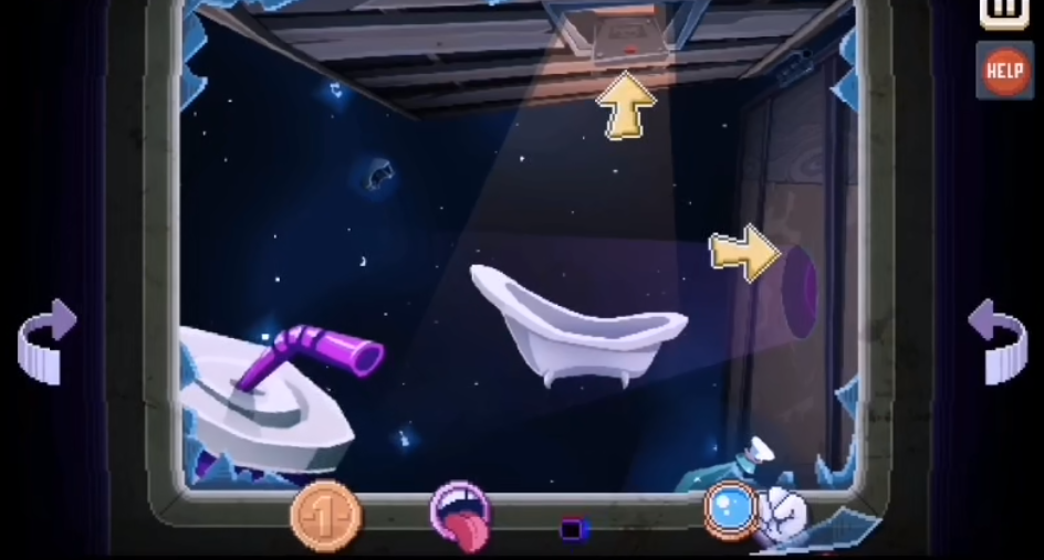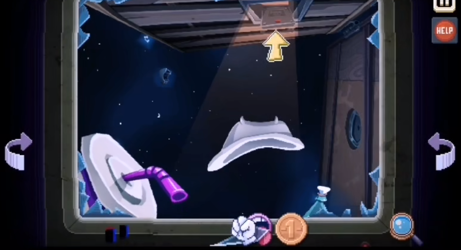 这个时候我们需要回到紫色漩涡的内部,提醒夏洛克福尔摩斯和约翰华生从旁边的洞中跳进去,但是夏洛克福尔摩斯和约翰华生不愿意跳,因为他们没有看到另一边有任何可以着地的地方。这个时候我们需要回到物品库中,使用黑色马赛克将那个长得像帽子的物体反转过来,这个物体反转过来之后就变成了一个像浴缸一样的容器,现在夏洛克福尔摩斯和约翰华生跳过来之后就有落脚点了。