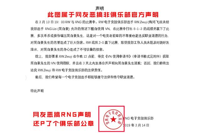 这回的网友直接恶搞制作了一张RNG电子竞技俱乐部官方的声明,因为zwuji使用vn没有向uzi提交申请书。如果是一种普通的恶搞声明也就算了,结果偏偏下面还ps了一个皇族电子竞技俱乐部的公章!这一波操作直接让事件的性质发生了变化,很多人说这属于伪造公章性质很恶劣,并且也给俱乐部带来了很大的负面影响,如果追究的话这位网友可就惨了。