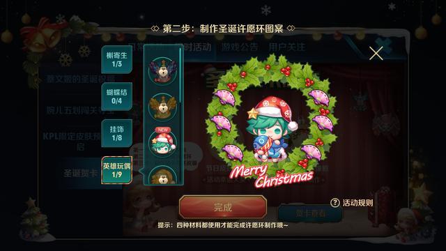 在活动面板上的限时活动中,每日登录领取材料和皮肤抽奖礼包,然后将四种不同类型的材料合成许愿环,再选择祝福语制作成贺卡,最后将贺卡发送给好友,就能领取圣诞专属头像框了,最快也需要两天才能完成。