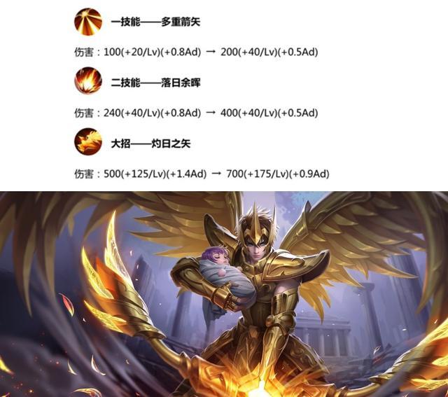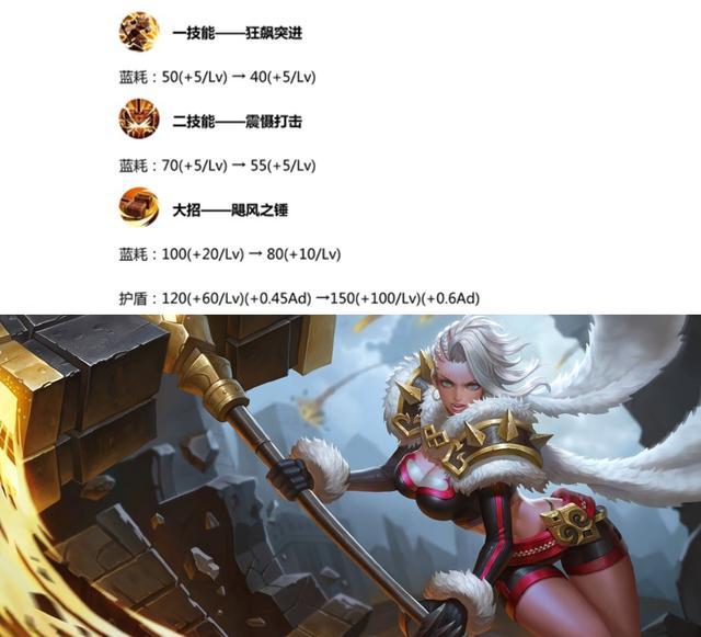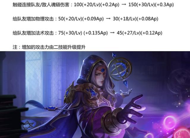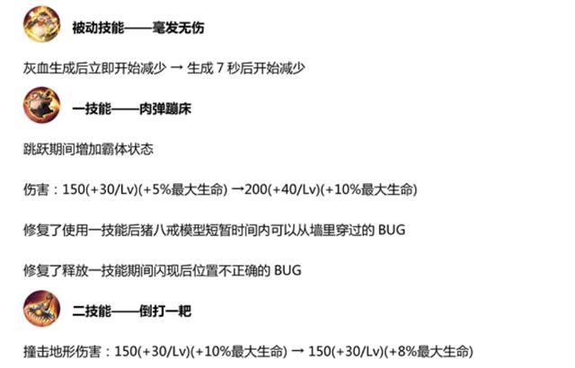 所有技能的前期伤害增高,后期伤害降低。1技能回复效果移除,大招CD减少,释放更快,范围更广。