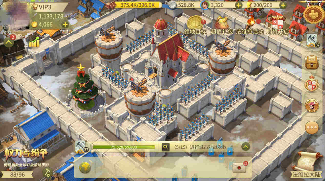 圣诞福利,城市焕然一新。网易首款全球开放策略手游《权力与纷争》已在App Store独家首发,凭借自身丰富的玩法,游戏已吸引了大批玩家入驻法维拉大陆,并踏上了属于自己的争霸之旅!恰逢圣诞节之际,游戏将开启圣诞节专属活动,即日起至1月3日,三大圣诞活动将陪伴领主们度过一个福利满满的圣诞节!