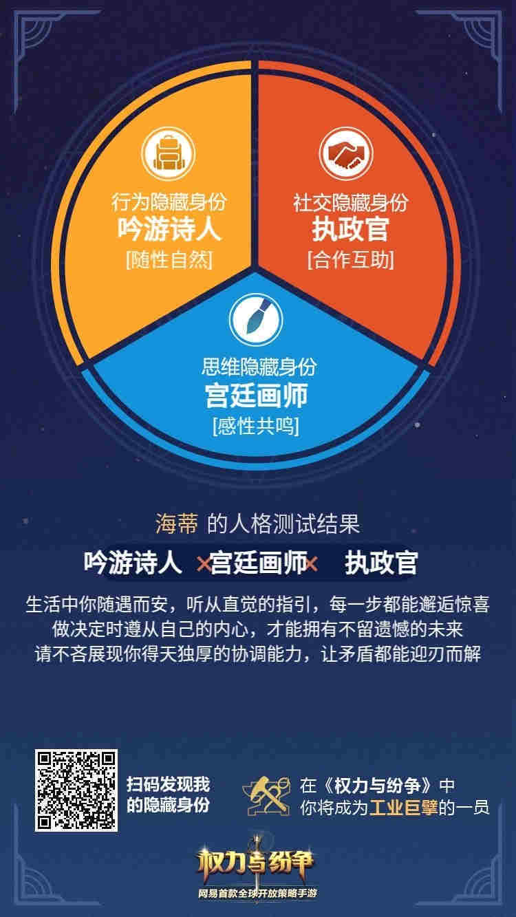 随性自然的吟游诗人、擅长合作互助的执政官、崇尚理解至上的牧师……你的隐藏身份又是什么呢?赶快扫码参与测试,探寻真实的自己吧!此外,玩家还可以立即下载《权力与纷争》,在战火纷飞的法维拉大陆中,探寻自己的隐藏身份,发现适合自己的派系,金钱帝国、工业巨擘、战争之王三大派系任你选择,将为你提供一个施展自我的绝佳舞台!