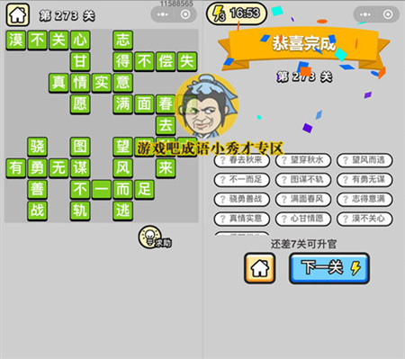 成语小秀才的第273关答案是什么?这款小游戏大人小孩都非常适合,既休闲又益智。